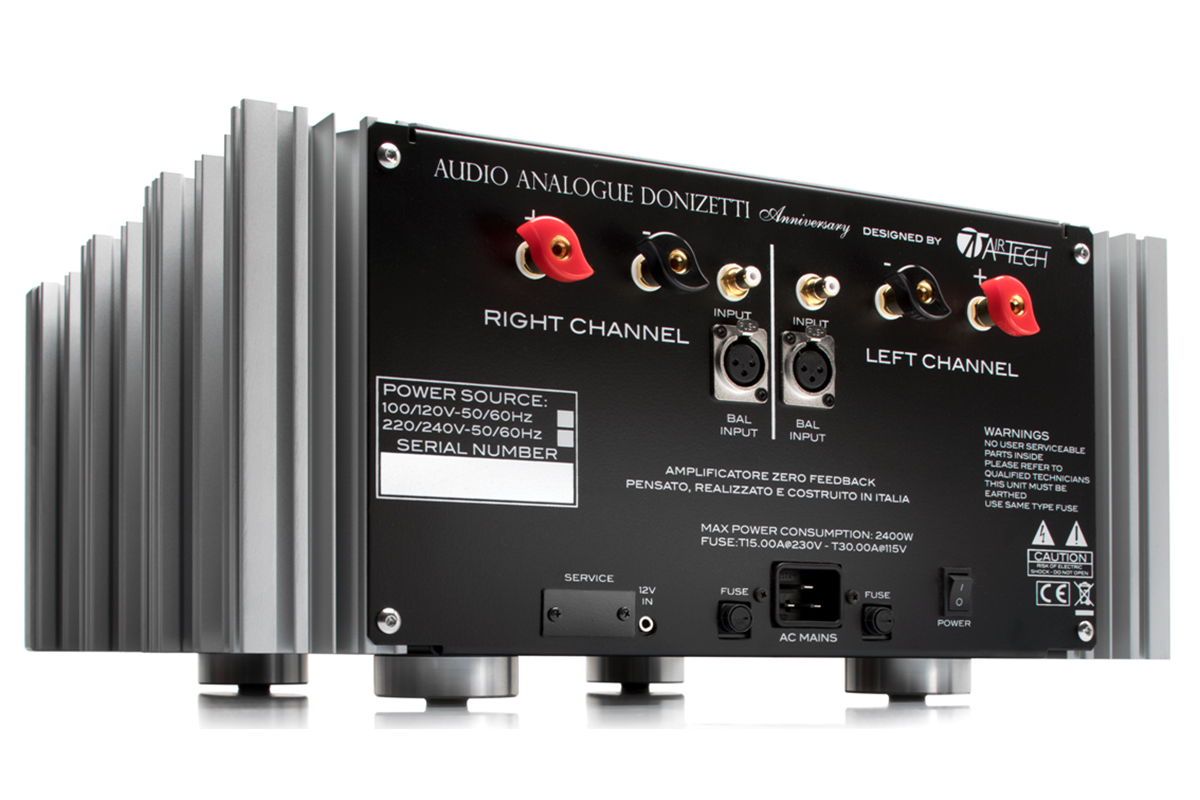 Effektforsterkeren Donizetti Anniversary, Er en del av Audio Analogue, designet i Airtech-laboratoriene, er en del av Anniversary-serien. Det eneste som er felles mellom denne nye modellen og tidligere versjoner av Donizetti er navnet, mens prosjektet og de tekniske løsningene som brukes er helt nye. Det er en stereo med høy effekt: med sin 250W@8Ω som dobler halveringen av impedansen, er den i stand til å drive alle høyttalere perfekt.