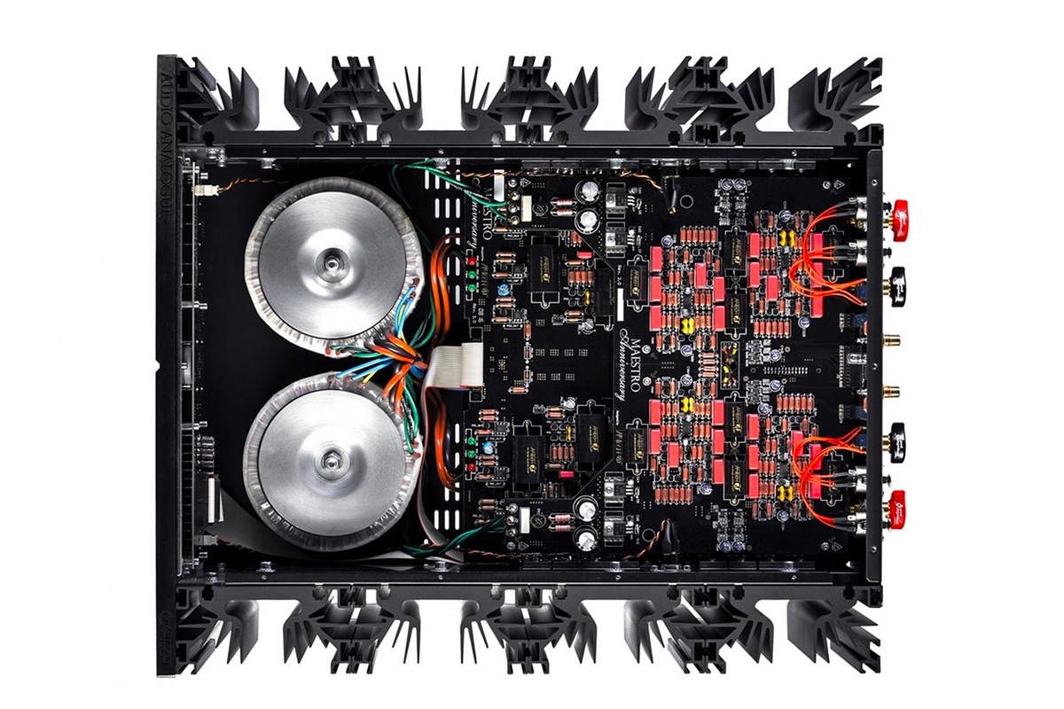 Den grunnleggende konfigurasjonen forblir invertert kaskode som kan sammenlignes med et enkelt forsterkningstrinn etterfulgt av utgangsbufferen. Stabiliteten til arbeidspunktet opprettholdes gjennom en DC -servo som begynner å fungere bare ved frekvenser under noen få tideler av Hertz (da helt utenfor det hørbare). Takket være en så raffinert krets, sammen med utvalgte komponenter på det høyeste nivået (militære standardmotstander, polypropylen audiograd kondensatorer skreddersydd for AIRTECH, interne ledninger med 7N OCC kobber og rene kobberutgangskontakter) bidro til å lage en forsterker som har æren av å være arvingen til den strålende Maestro Integrated og slutter seg derfor fullt ut til jubileumslinjen som feirer på samme tid, de første 20 årene av Audio Analogue, men også 15 år ved introduksjonen av AUDIO ANALOGUEs første produkt som bærer Maestro -navnet.